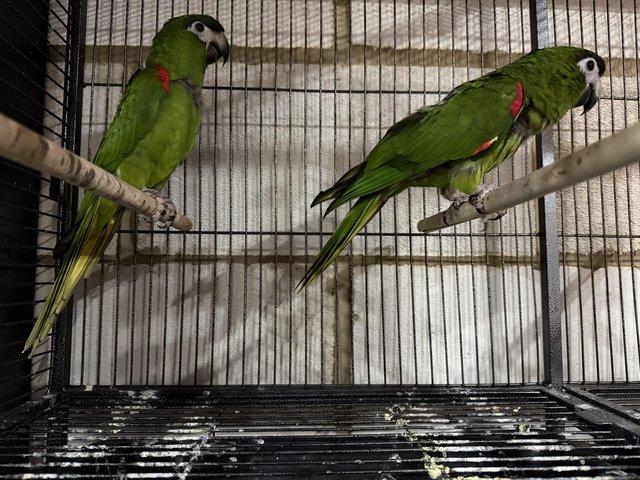 These two are a bonded pair and are happiest together. They have a calm and steady nature, making them suitable for experienced bird keepers or those familiar with small macaw species.