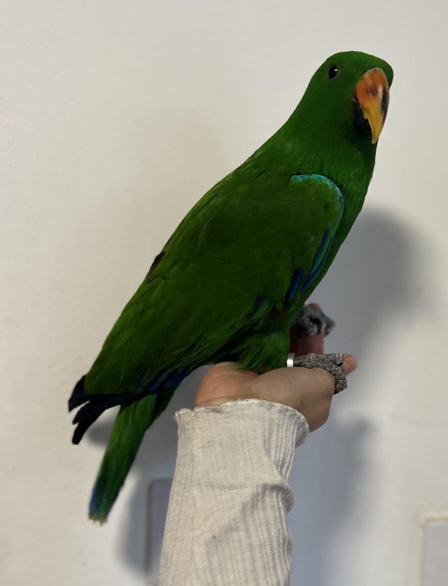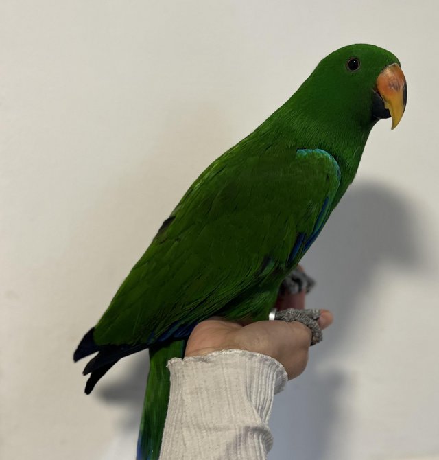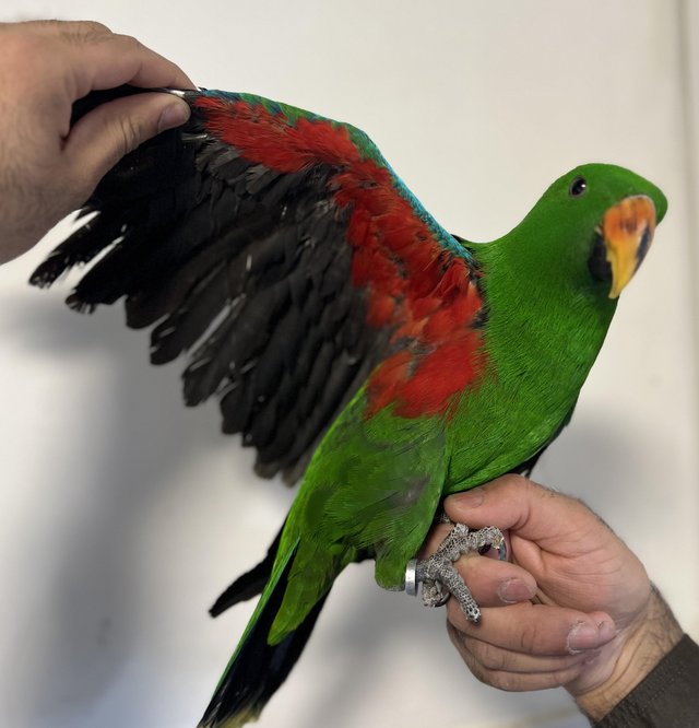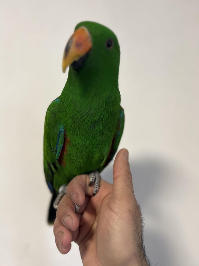 If you are looking to buy Eclectus baby parrot in the UK, Pickle is a beautiful, hand-reared baby male with an affectionate personality and outstanding talking potential.