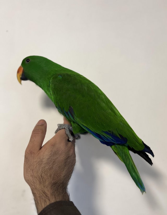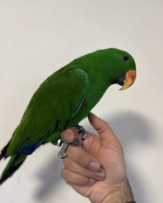 Male Eclectus parrots are well-known for their clear speech and impressive vocabulary. Pickle is already experimenting with sounds and early speech attempts. With continued interaction and regular training, he has the potential to develop an extensive and clear vocabulary, making him an excellent companion for someone wanting a talking parrot.